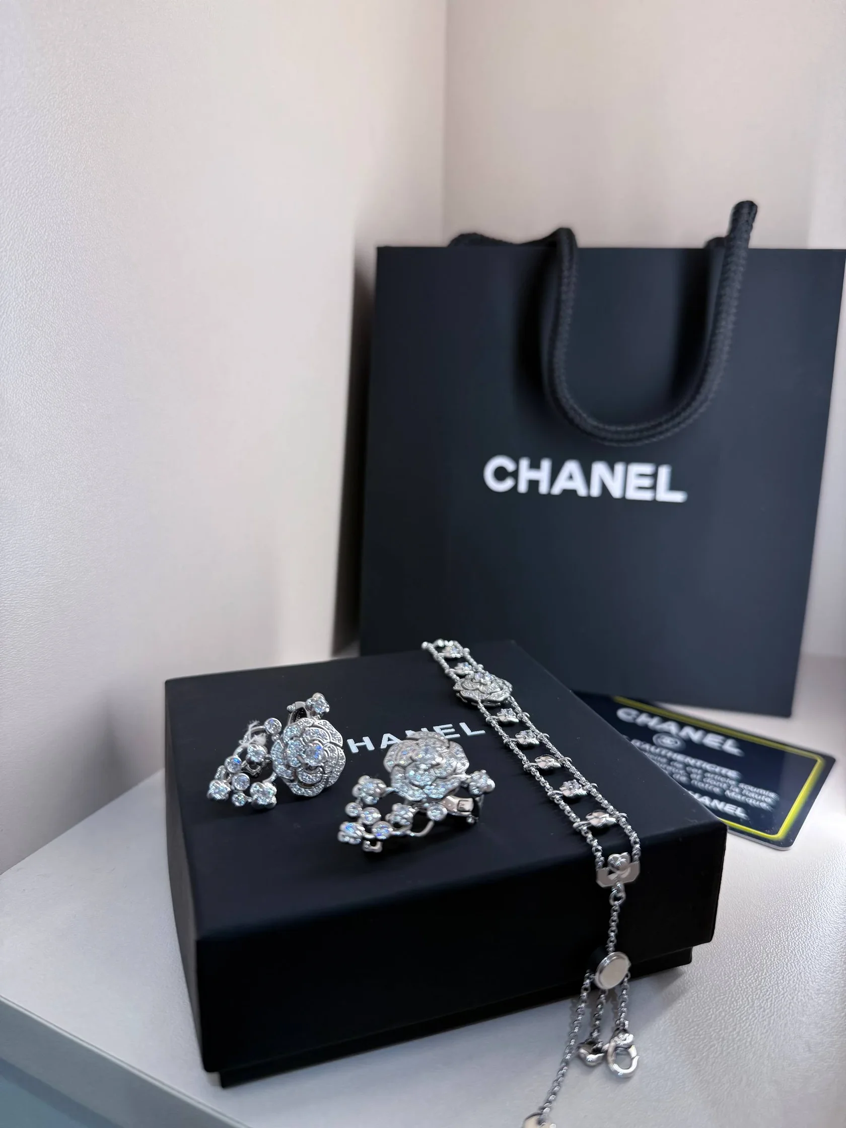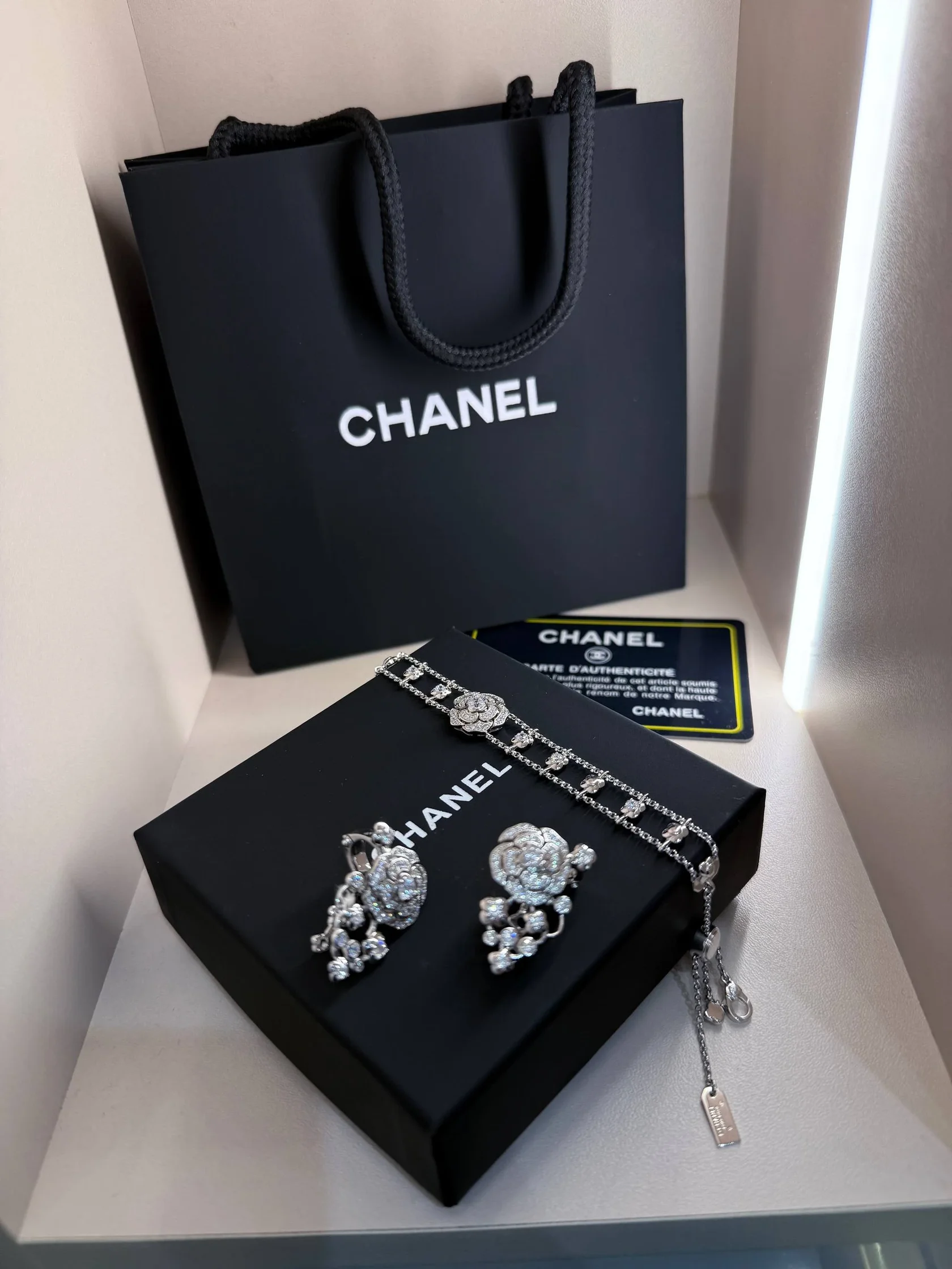 Ключевые особенности: - Колье — изящный дизайн с фирменными камелиями, подчеркивающий линию шеи - Серьги с камелиями — элегантные украшения со сверкающими кристаллами, добавляющие образу сияния - Браслет CHANEL — стильное дополнение, гармонично сочетающееся с комплектом - Высококачественные материалы — латунь с золотым покрытием и кристаллы